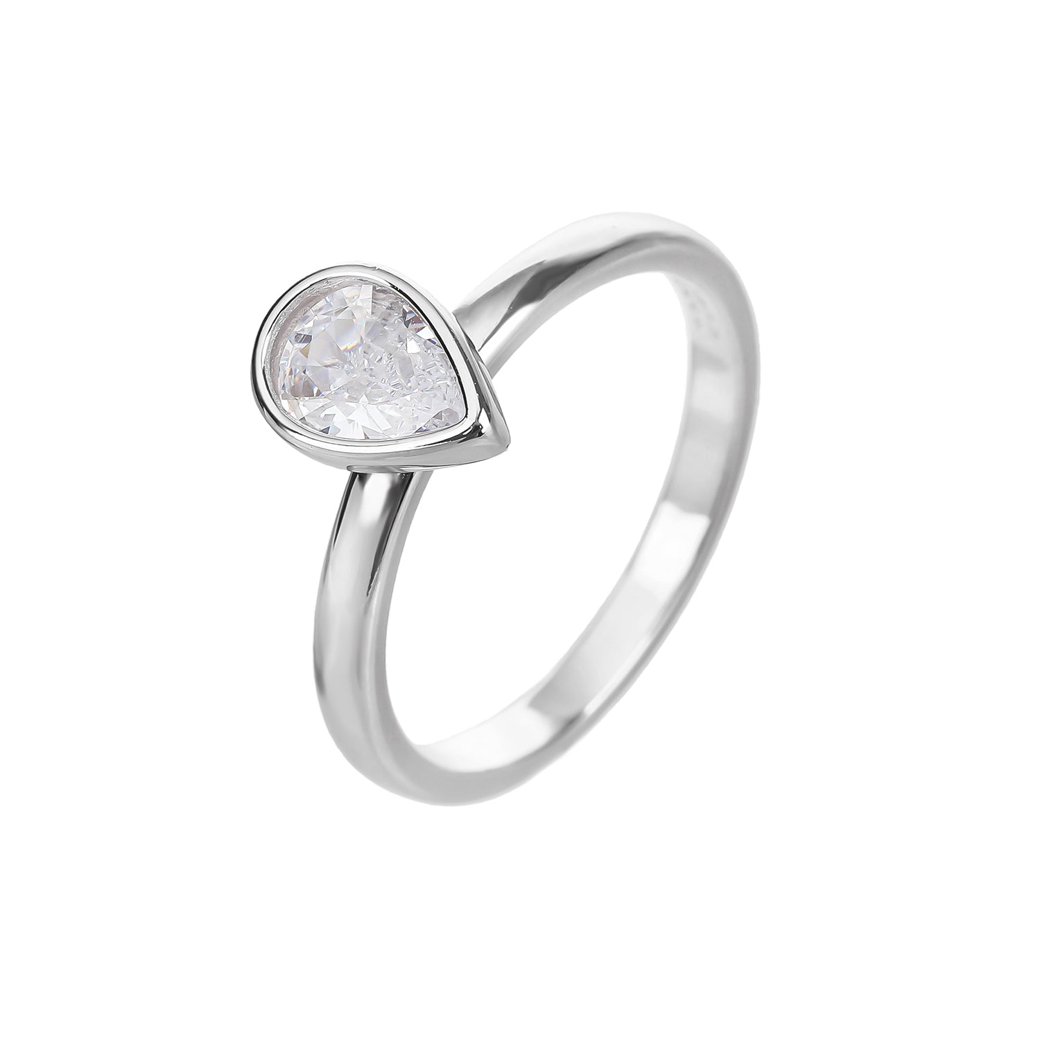 טבעת כסף עם אבן בצורה טיפה, משובצת בשיבוץ סגור למראה מוקפד ומודרני,