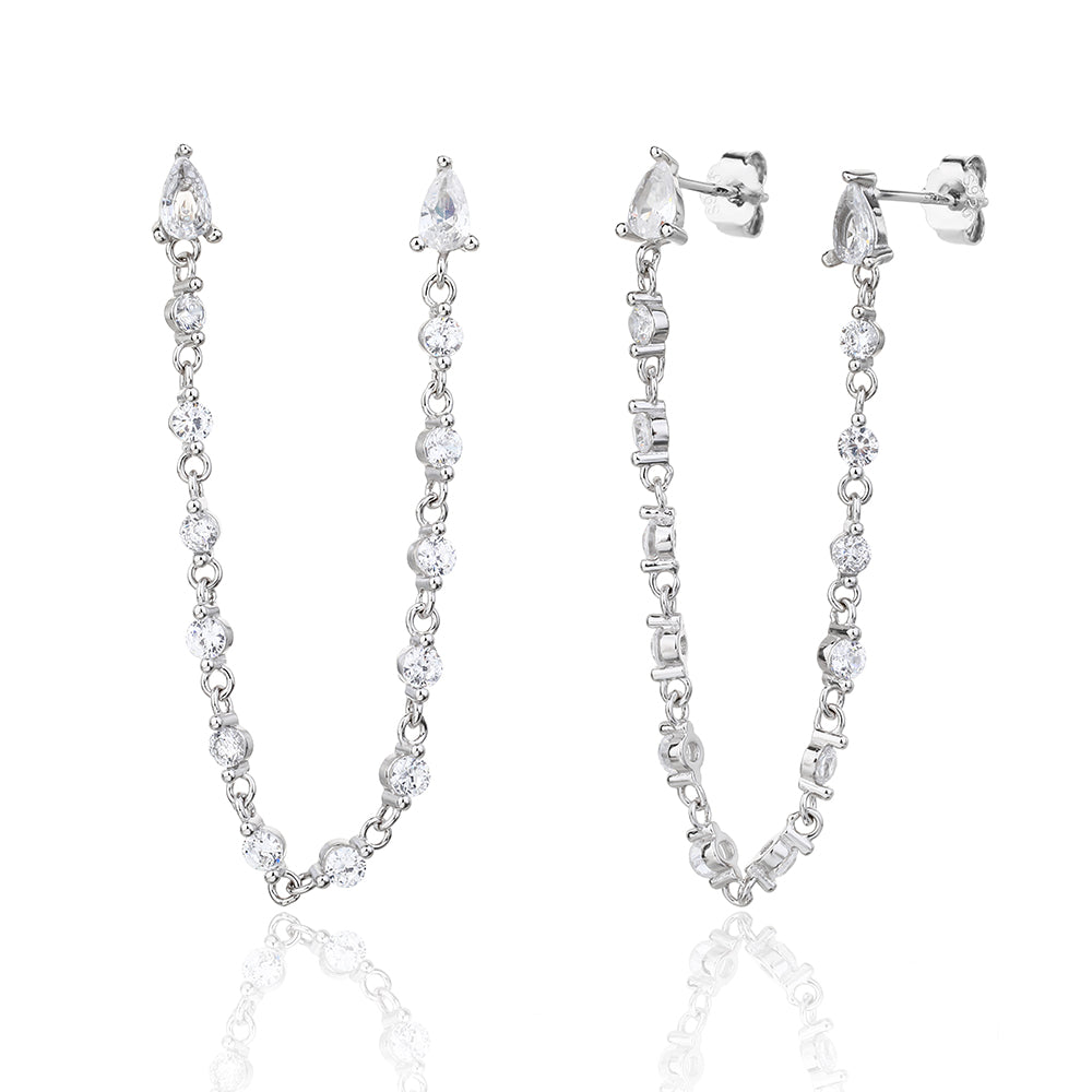 עגיל כפול עם טקסטורה עשירה של שיבוץ זרקונים לאורך כל השרשרת, שמתחילה מאבן טיפה עדינה,
